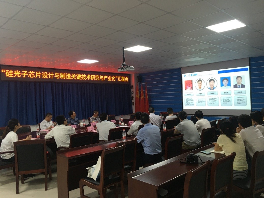 2019年7月16日,太阳成集团tyc234cc召开“硅光子芯片设计与制造关键技术研究与产业化”汇报会。重庆市科委许志鹏处长、重庆市九龙坡区罗虎副区长、重庆市沙坪坝区科技局黄鑫处长、重庆电子工程职业公司党委书记孙卫平、太阳成集团tyc234cc经理陈良以及“硅光子人才培养与技术创新中心”相关人员参会。会议由公司科研与社会服务处许磊处长主持。