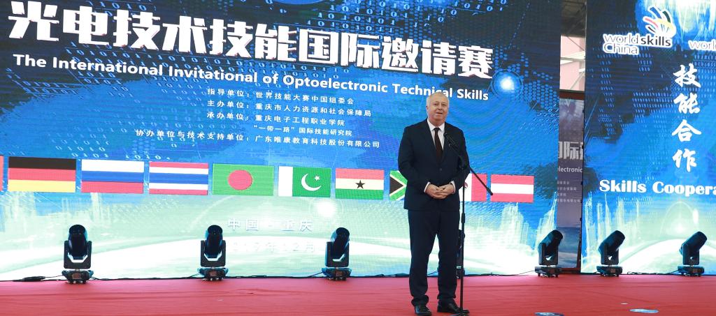 重庆电子工程职业公司党委书记孙卫平致辞中介绍了公司的发展情况和大赛背景。他谈到,“新一代光电技术的发展是万物互联时代的重要支撑,扮演着极其重要的角色”。重庆电子工程公司积极开展光电技术领域的技术技能人才培养工作。他表示公司“有能力、有实力做好光电技术赛项,为全球技能人才培养提供一个尝试技能、了解技能、获得技能的国际化平台” 。