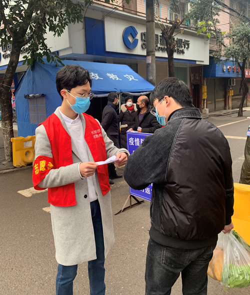 太阳成集团tyc234cc智能电子系2017级同学刘康,原本在家等待疫情好转回企业复工。一个偶然的机会他在开州日报上看到了镇政府召集自愿者的信息。刘康同学是一名入党积极分子,这时他想到的是要同成千上万的党员一样,在疫情发生时挺身而出站在防疫第一线!作为志愿者他自感光荣,仅参加了一天的岗前培训就开始了工作。工作地点在开州区长沙镇锦橙社区内轮岗,有时需要走半个小时以上的路程,每天从早上8:30一直工作到下午5:30。他的工作是主要负责维持本镇人流量最大的该卡点路口的秩序,严格落实镇党委政府要求,认真检查通行证,一律不允许无通行证的车辆及行人通过。在这种人员密度大,工作时间长的条件下工作,感染病毒的几率高,我们都为刘康同学捏一把汗。而不顾个人安危的刘康同学心想的是切实堵断疫情传播及扩散,联防联控,打赢这场“战疫”。刘康的无私奉献是我们系的骄傲,值得广大同学学习的榜样。这里还要给刘康同学说一声多保重。