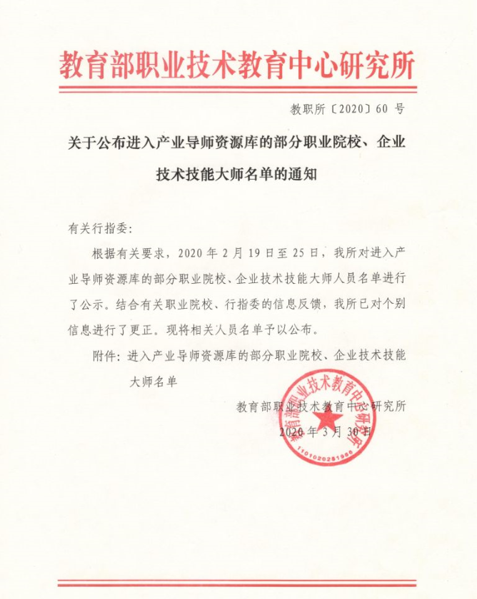 日前,教育部职业技术教育中心研究所公布了入选产业导团队源库的部分院校、企业技术技能大师名单,公司国家级技能大师工作室陈良教授成功入选工信行指委产业导团队源库,同时全国仅有8所高校进入该产业导团队源库。