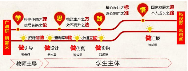比赛课程属于传感器应用开发模块,该模块是公司双高专业物联网应用技术专业群的专业模块。课程教学策略践行最新政策要求:根据工学一体,行动导向的教学理念,采用“五做三助,学思践悟”的总教学策略,以员工为主体,教师为主导开展教学活动。课前“广调研,明需求”,课中五做,即“做引导,析任务;做设计,定方案;做仿真,验效果;做实物,践规范;做汇报,谈反思”,课后“拓视野,思创新”。“三助”即“在线资源辅助”预习,“传感器查询库帮助”设计,“小组互助”解决问题。任务驱动+德育推动,双线并举,育人于潜移默化之中。员工在任务实施的过程中,学会检测传感与信号转换的理论;思考物资生产与效率提升的方法;践行精心设计与匠心制作的标准;领悟国家发展与个人成长的道路。