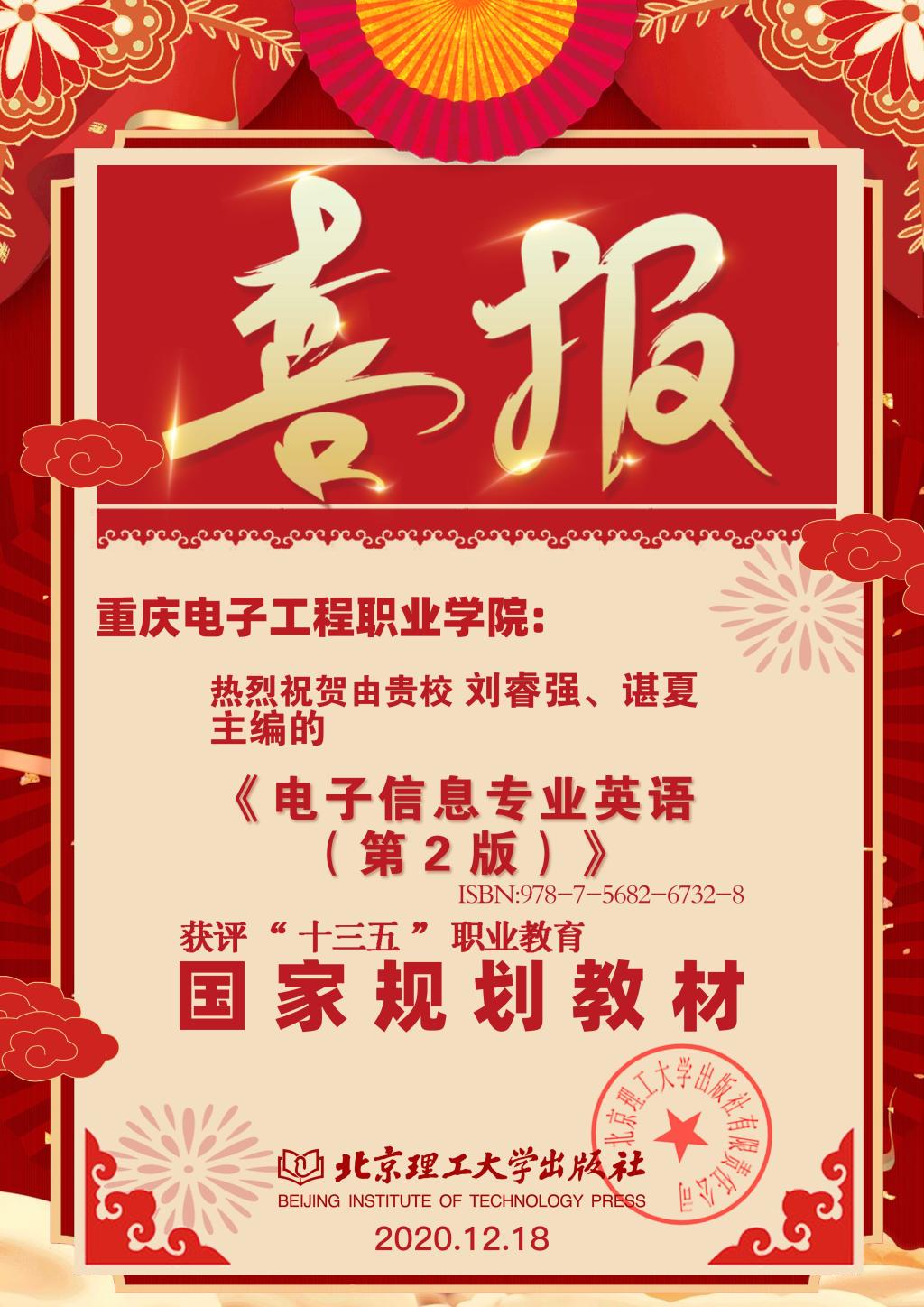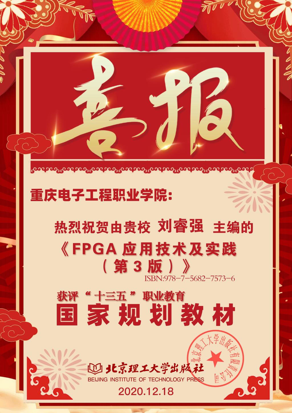 为贯彻《国家职业教育改革实施方案》,落实《职业院校教材管理办法》,不断加强职业院校教材建设,教育部职成司印发《关于组织开展“十三五”职业教育国家规划教材建设工作的通知》等文件。经有关单位申报、形式审查、网络和会议评审等程序,共有3975种教材入选“十三五”职业教育国家规划教材书目。2020年12月,教育部办公厅公布了“十三五”职业教育国家规划教材书目,公司微电子技术专业两种教材入选“十三五”职业教育国家规划教材,分别是刘睿强、谌夏等主编的《电子信息专业英语》,刘睿强、尹洪剑、冀云等主编的《FPGA应用技术及实践》。