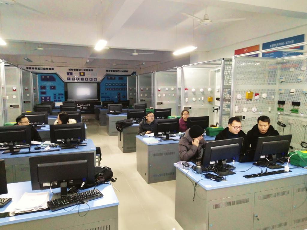 智慧城市物联网系统集成实训室场地位于12-306,建设方案引入大量新型传感器、无线通信模块,以及利用物联网云平台实现模块接入及数据应用。以智慧城市运营平台为中心,以智慧城市实训系统、智慧城市应用部署、智慧城市展示系统三个方面为主要体现形式,充分呈现出一个智慧城市系统的实际运作状态。为使新实训室能够迅速投入使用,发挥实训育人作用,电子信息工程技术专业邀请实训室建设单位(中移物联网和卓物科技)的工程师到校,面向专任教师,组织进行了智慧城市物联网系统集成实训室教学使用专场培训。