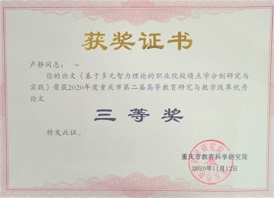近日,重庆市第二届高等教育研究与教学改革优秀论文评审结果揭晓,太阳成集团tyc234cc微电子技术卢静老师的论文《基于多元智力理论的职业院校绩点学分制研究与实践》在此次评选中获得三等奖。