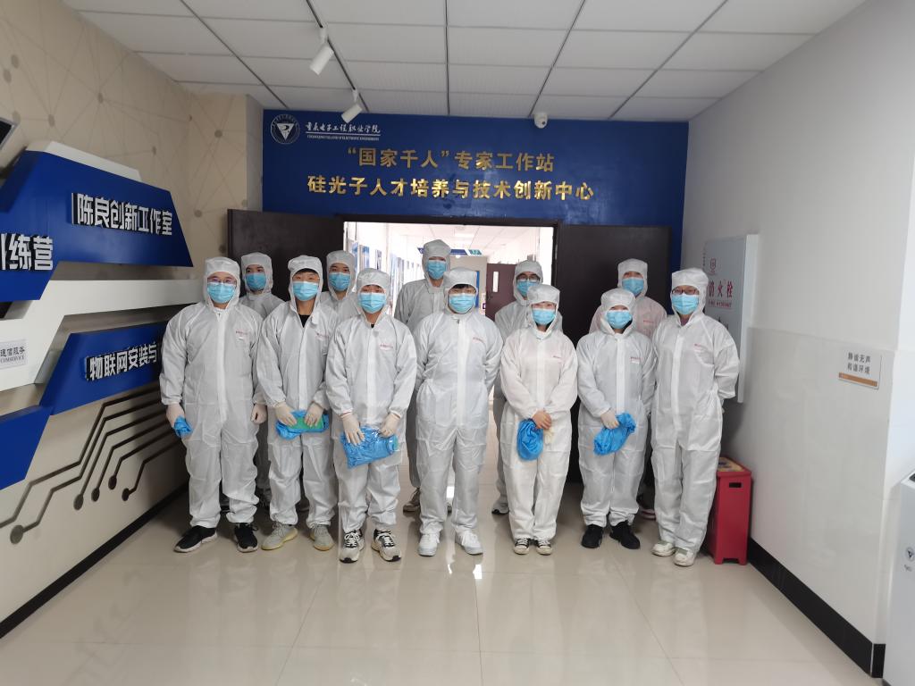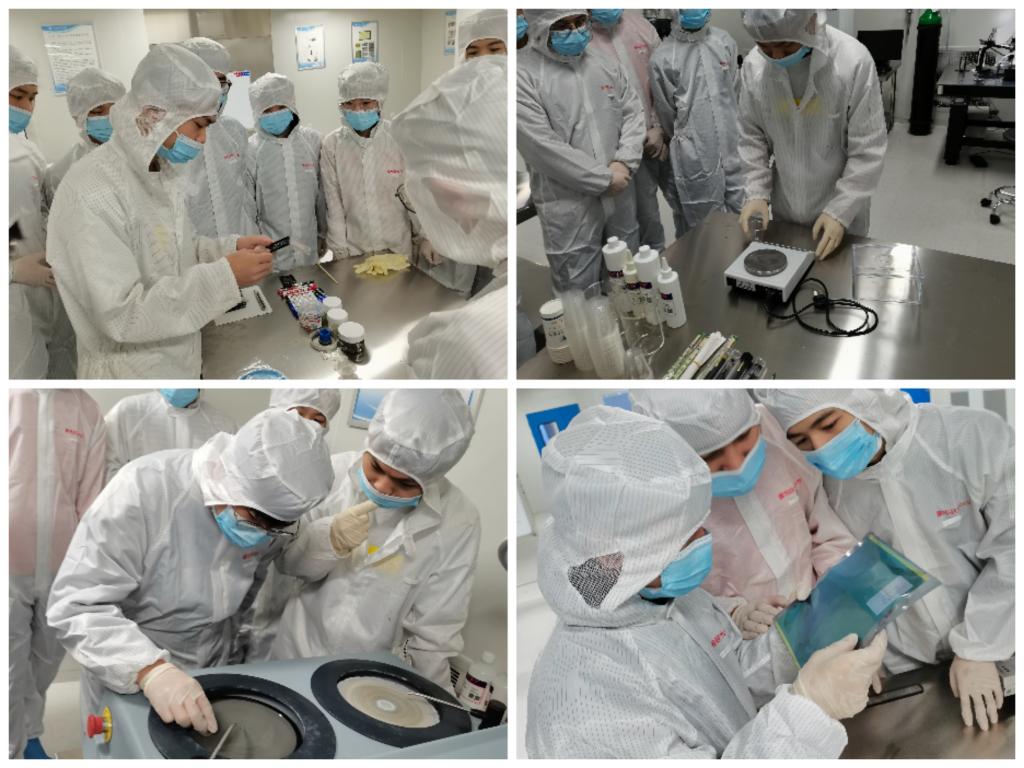 硅光中心拥有的无尘室是国内高职院校里第一所千级无尘室。同学们系统地学习了无尘室的相关知识。经过培训后,穿上专用的防静电服,通过风淋室进入了千级无尘室。浙江光特科技有限公司技术人员在无尘室内为大家介绍了光学数码显微镜、超高解析度扫描式电子显微镜的用途、亚微米贴片机的使用方法和芯片的制样和磨抛工艺等,并手把手带领同学们进行了芯片制样和磨抛工艺的实训。