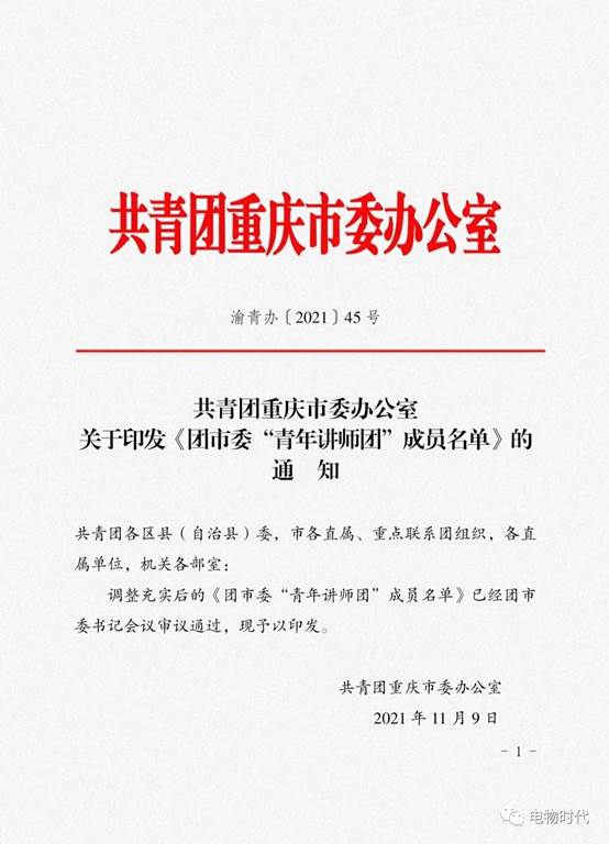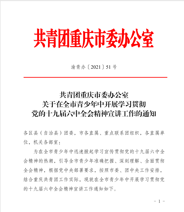 公司总支副书记毛弋入选共青团重庆市委“青年讲师团”(党史、新中国史、改革开放史、社会主义发展史、团史小组)。团市委“青年讲师团”,为在全市青少年中迅速掀起学习宣传贯彻党的十九届六中全会精神的热潮,引导全市青少年准确把握、深刻理解、全面贯彻全会精神。根据党中央部署要求,按照市委、团中央工作安排,结合重庆共青团工作实际,在全市青少年中开展学习贯彻党的十九届六中全会精神宣讲工作所成立。