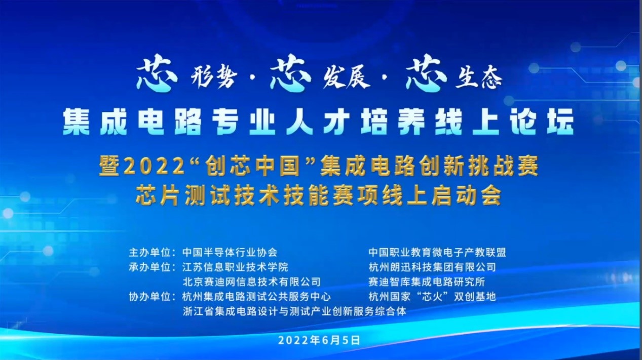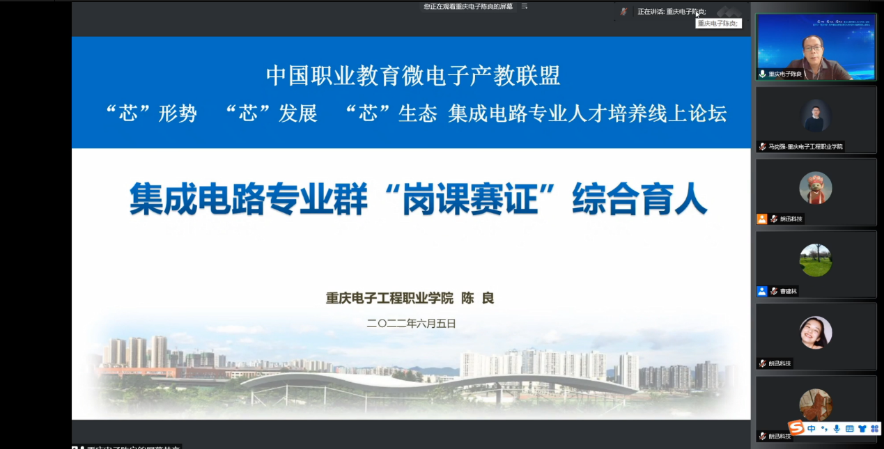 6月5日,由中国半导体行业协会、中国职业教育微电子产教联盟主办的“集成电路专业人才培养线上论坛暨2020创芯中国集成电路创新挑战赛芯片测试技术技能赛项线上启动会”顺利召开。会议以线上方式进行。来自中国半导体行业协会、赛迪研究院、杭州朗迅科技、东南大学、西安电子科技大学、浙江大学等集成电路领域的专家教授参会。公司经理陈良教授受邀作题为《集成电路专业群“岗课赛证”综合育人》主旨演讲,公司集成电路专业群骨干教师在线参会。