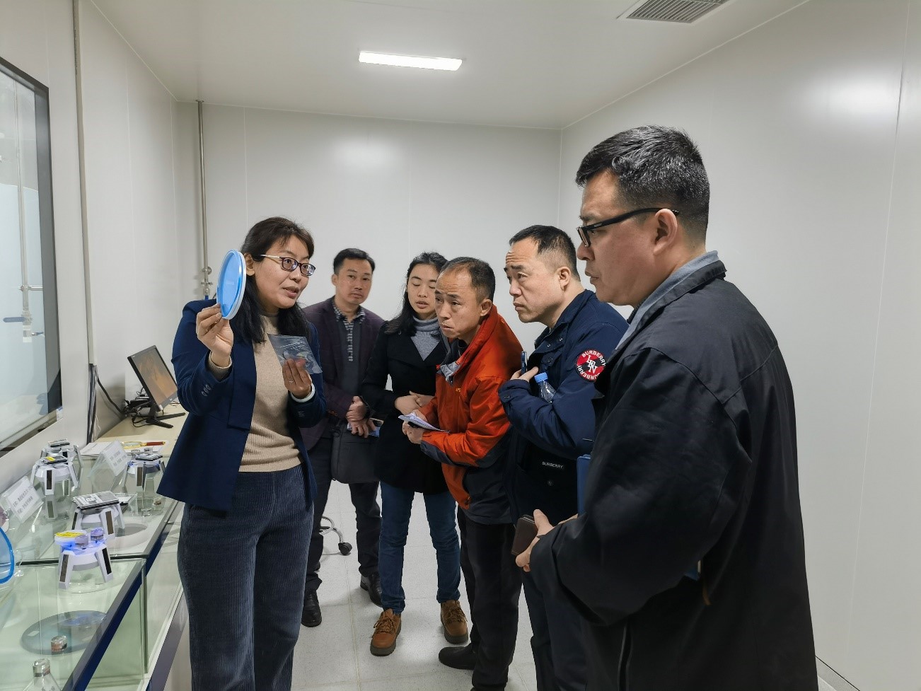 卢静、牛欣玥老师向专家领导介绍了硅光中心的人才配置和硬件设施,并向他们展示了中心近年来在教育和科研方面的成果。重点介绍了中心目前的产学研的发展模式及方向。领导们对千级无尘室产生了极大的兴趣。详尽地询问了集成电路工艺环境搭建条件和运营维护方式。然后双方就集成电路硅光领域的发展前景和人才培养的难点痛点进行了深入交流。