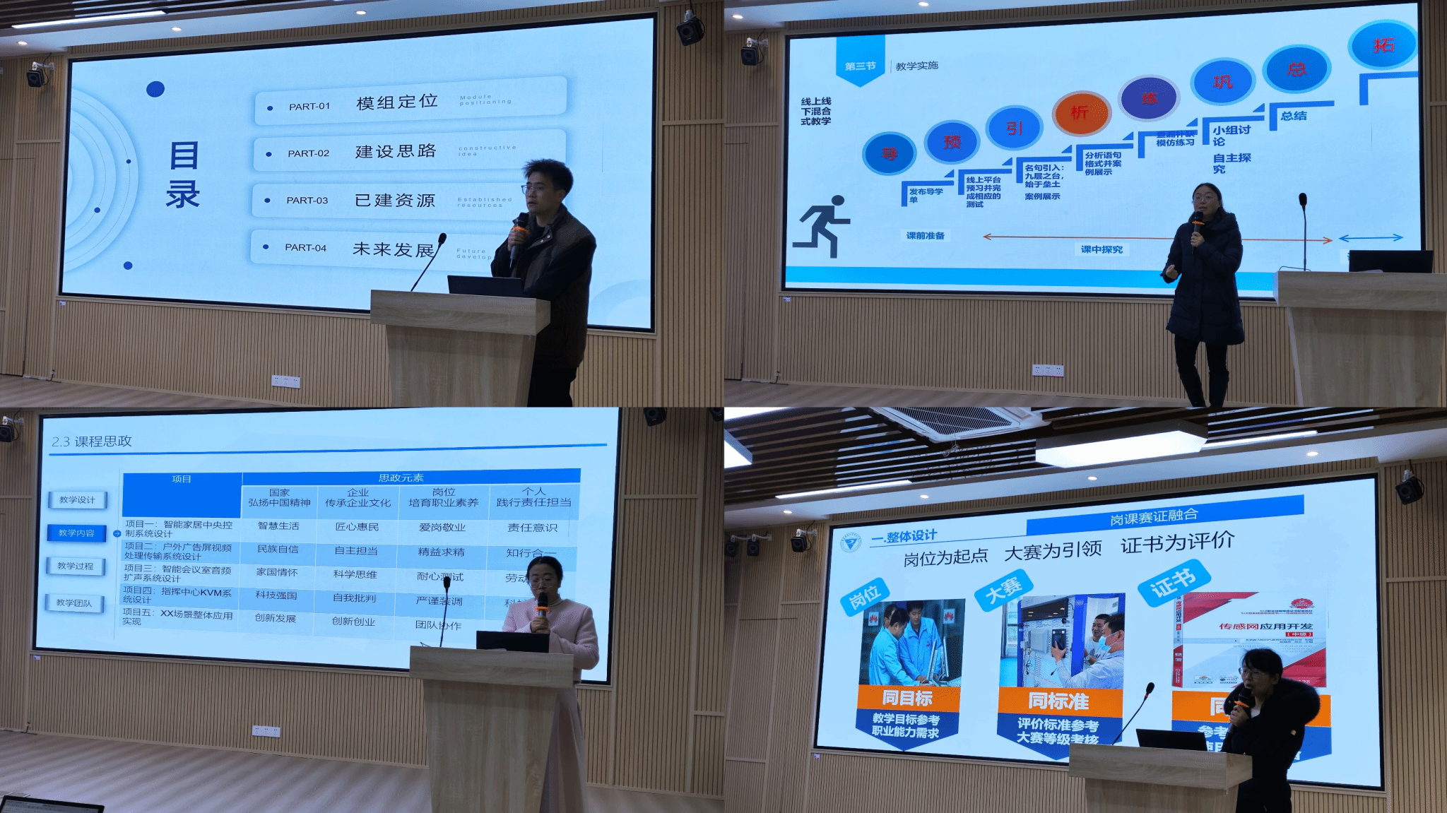 比赛现场氛围紧张而热烈。参赛教师们以模组为单元,围绕各自模组和课程内容依序展开精彩的说课,限时15分钟展示时间。模组的参赛教师从模组定位、模组内课程间的关系、模组资源、模组建设思路、未来规划等方面进行介绍,展示了他们对模组设计的深入理解和思考;课程说课的参赛教师则围绕课程标准、课程设计、课程资源、教学实施、教学评价、思政融入等方面进行说课,展示了他们对课程设计的深入思考和创新思维。他们的表达清晰准确,语言流畅自然,展现出了扎实的教学功底和丰富的教学经验。