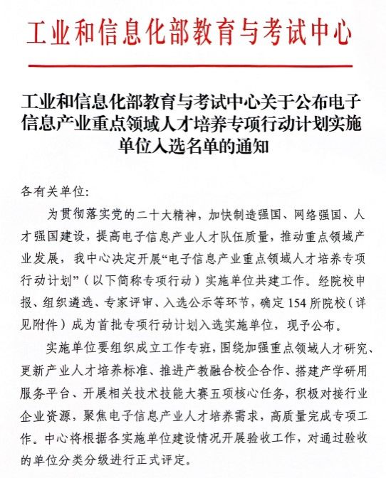 4月22日,工信部教育与考试中心正式公布“电子信息产业重点领域人才培养专项行动计划实施单位入选名单”,公司成功入选首批实施单位。
