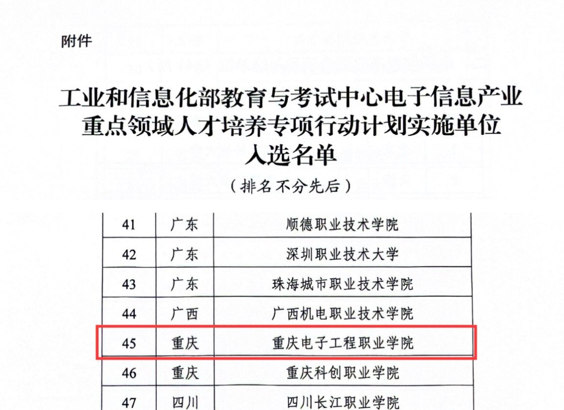 此次计划经过院校申报、组织遴选、专家评审等程序,全国共有154所院校入选,公司以集成电路技术、微电子技术两大专业为核心的集成电路专业群申报本次专项行动计划,并成功脱颖而出,成为首批专项行动计划入选的实施单位之一。公告要求相关单位按照专项行动重点任务的要求及时启动相关工作,扎实推进计划实施。工信部教育与考试中心将组织开展检查、评估、指导、验收等工作,对通过验收的院校进行正式评定。