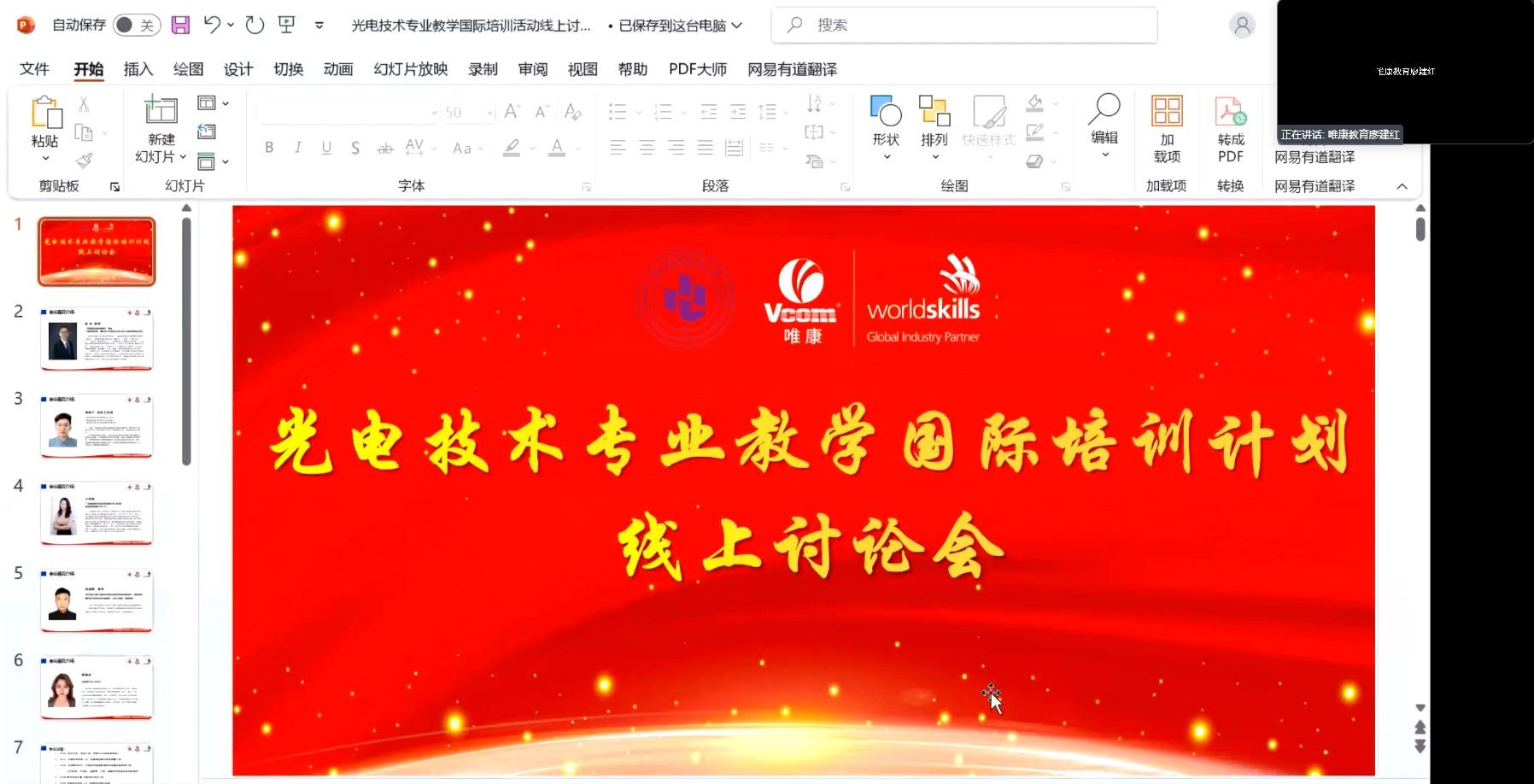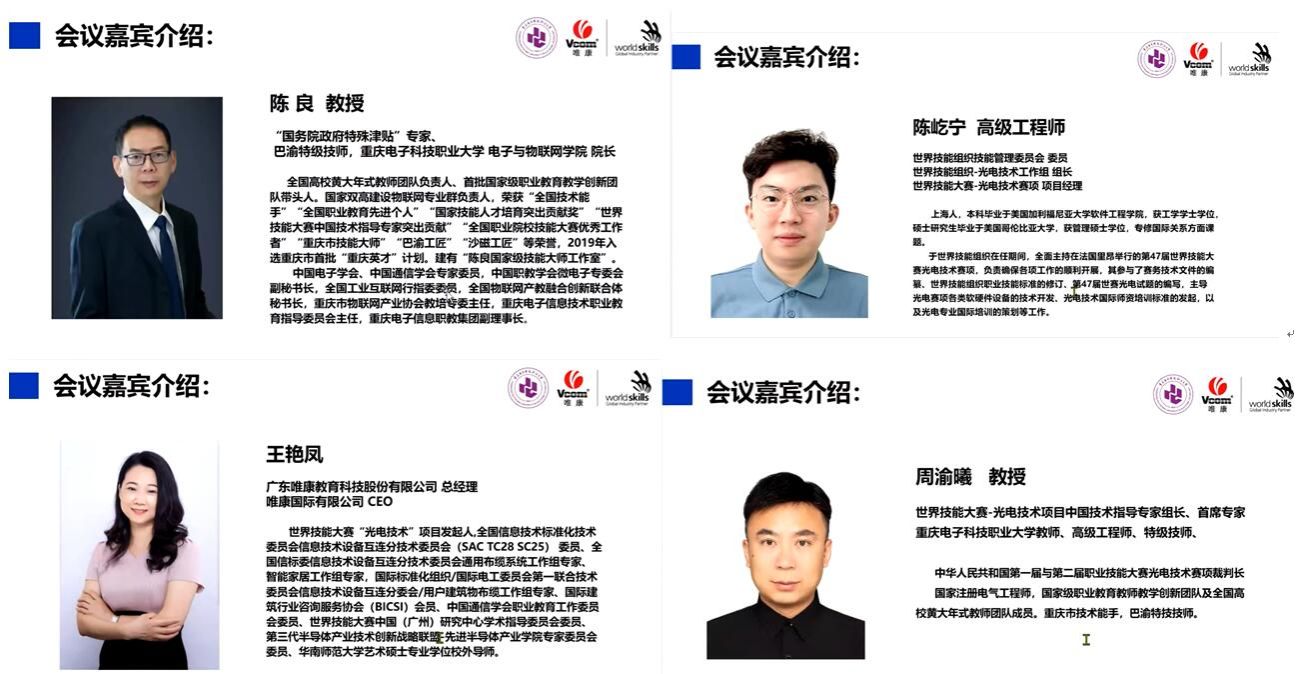近日,由太阳成集团tyc234cc和广东唯康教育股份有限公司(以下简称唯康公司)共同主办的“光电技术专业建设国际培训计划线上研讨会”顺利召开,来自全国50余所职业院校和技工院校的领导和专家参会。公司太阳成集团tyc234cc经理陈良教授、周渝曦教授及相关老师参会。
