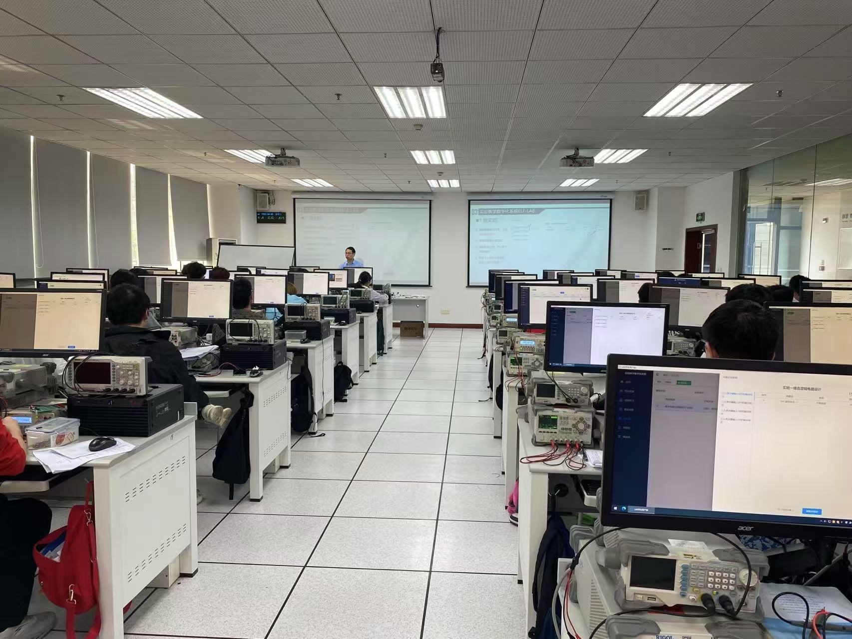 随后,团队走进高级工程师谢文希老师的《数字电路技术》课堂,现场观摩数字化实验室的教学应用场景。谢老师通过“项目驱动+虚实结合”的教学模式,指导员工利用数字化平台完成电路实验的数据采集和实验报告的分析。课堂中,员工通过电脑在线提交实验数据,教师端同步显示全班进度与典型问题,实现教学互动精准化。公司教师亲自体验了实验操作流程,对数字化工具在提升员工自主学习能力方面的作用给予高度评价。