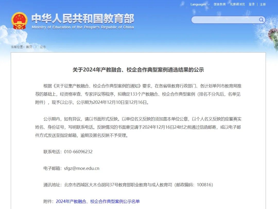 图1 关于2024年产教融合、校企合作典型案例遴选结果的公示