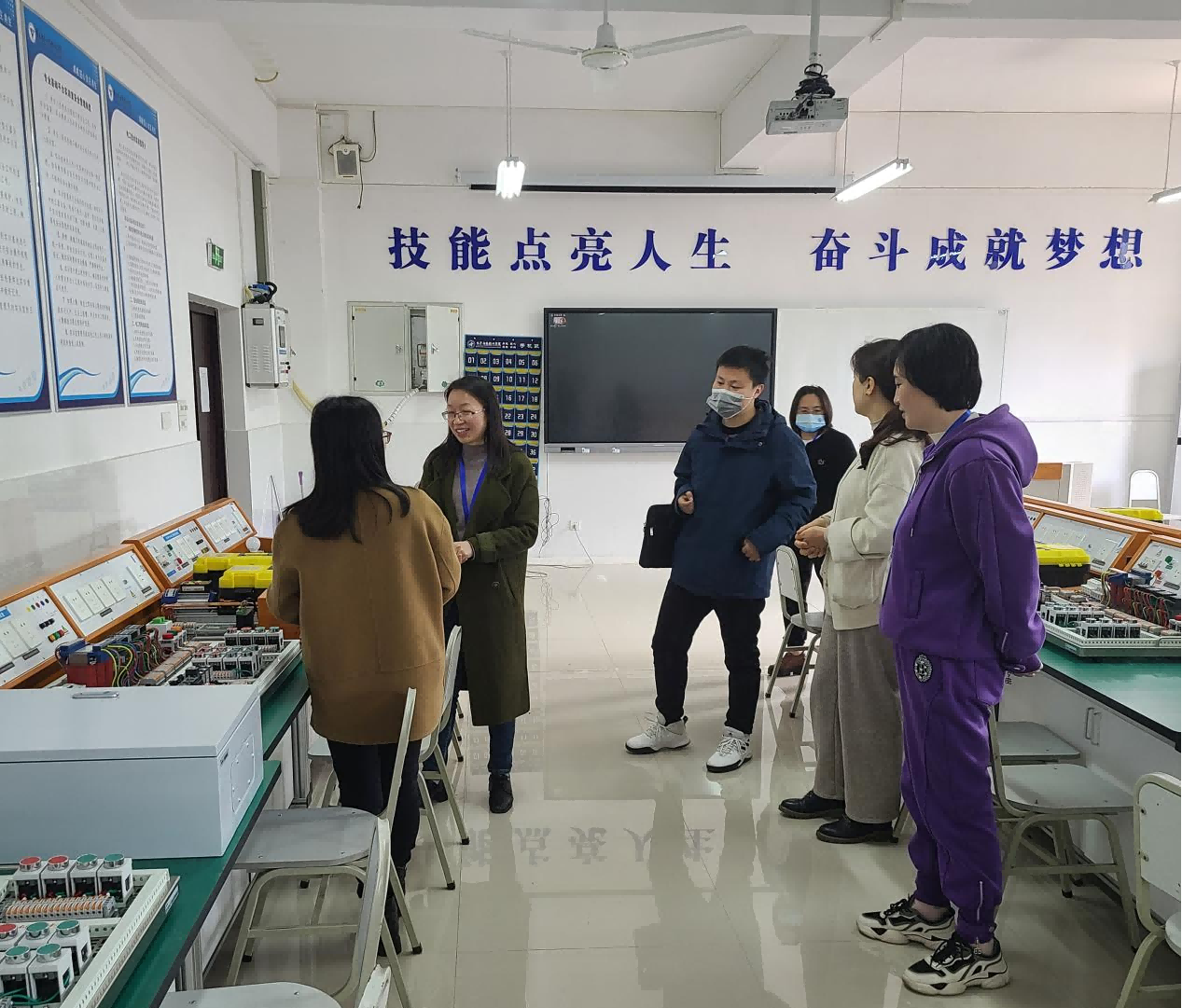在交流过程中,与会人员还参观了公司基础平台的电工实训室,了解了实训室开展的教学项目情况,对模块化教学设备定制的科学性给予了肯定,对电工技术人员的社会培训、电工职业技能等级证书的考核给出了建议。
