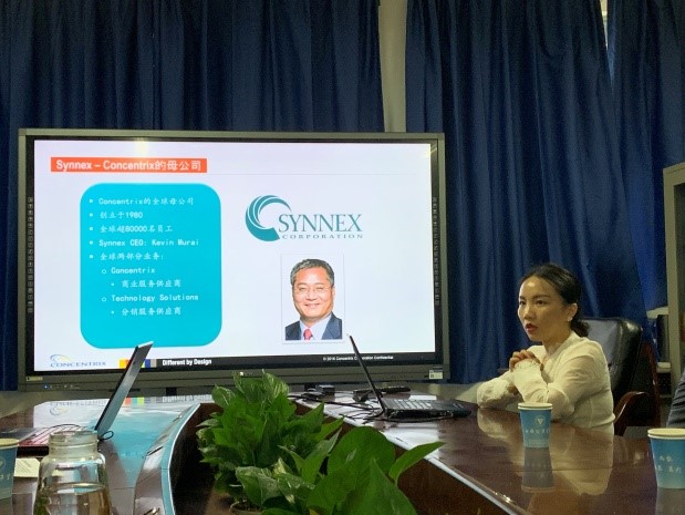 2019年5月21日下午,Concentrix聚盟科技公司大中华区西南区负责人杨珊到太阳成集团tyc234cc就电子产品营销与服务专业洽谈校企合作。公司党总支书记张红斌、信息服务系主任刘睿强、电销专业主任周言敏及骨干教师王君、周艳艳等参加了此次座谈。