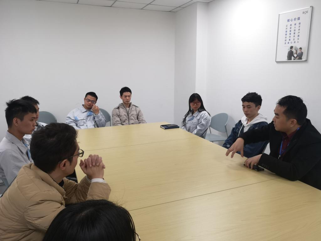 同学们都很高兴公司领导老师们能来走访看望,纷纷畅所欲言。这些员工来自机电一体化和应用电子专业,工作最久的是两位2014届毕业生,他们谈到个人的工作发展情况和经验体会,直言毕业后最重要的是能够认清自己,摆正心态,肯想肯学肯干;他们还非常关心母校的发展,问起公司近况以及毕业生的就业状况,希望能够尽自己的力量为相关专业毕业生提供帮助。最年轻的2016届毕业生认为京东方企业实力雄厚,工资待遇好,给了自己很好的基本生活保障,但这仅仅是工作的第一步,想要更好的发展,最主要的是不懈的努力和坚持。