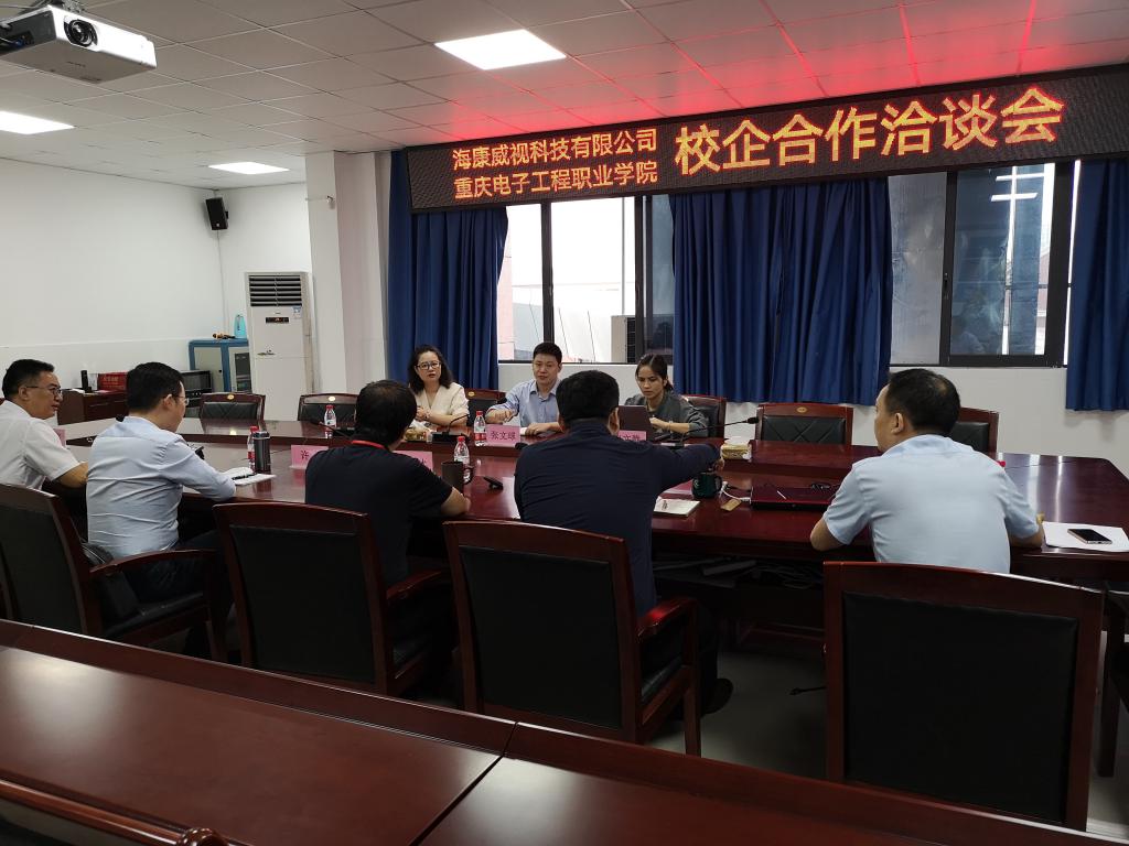 9月14日9:00,海康威视科技有限公司总部人力资源总监张文球、高级员工关系经理许渊、重庆海康威视科技有限公司人力资源经理向文静一行3人受邀来公司进行校企合作洽谈。公司科研与社会服务处处长许磊、公司党总支书记张红斌、副书记毛弋、智能电子系主任王用鑫等7人参会。