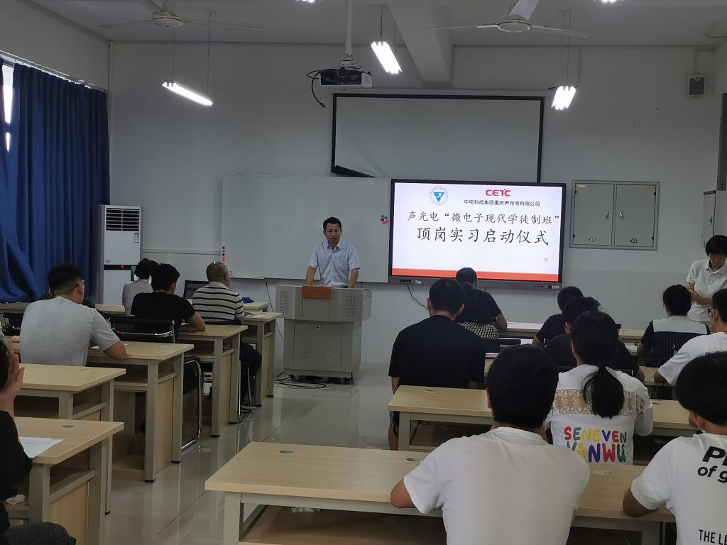7月6日,公司与中电科技集团重庆声光电有限公司(以下简称“声光电”)在公司举行“微电子现代学徒制班”顶岗实习启动仪式。声光电公司相关部门负责人及公司领导、骨干教师出席。