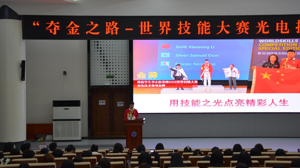 周渝曦组长介绍了世界技能大赛、大赛所包含的项目、光电技术赛项等,展示了公司员工李小松的夺金之路,解读了光电技术项目首次夺金的意义,分享了各种媒体关于李小松夺金的报道。