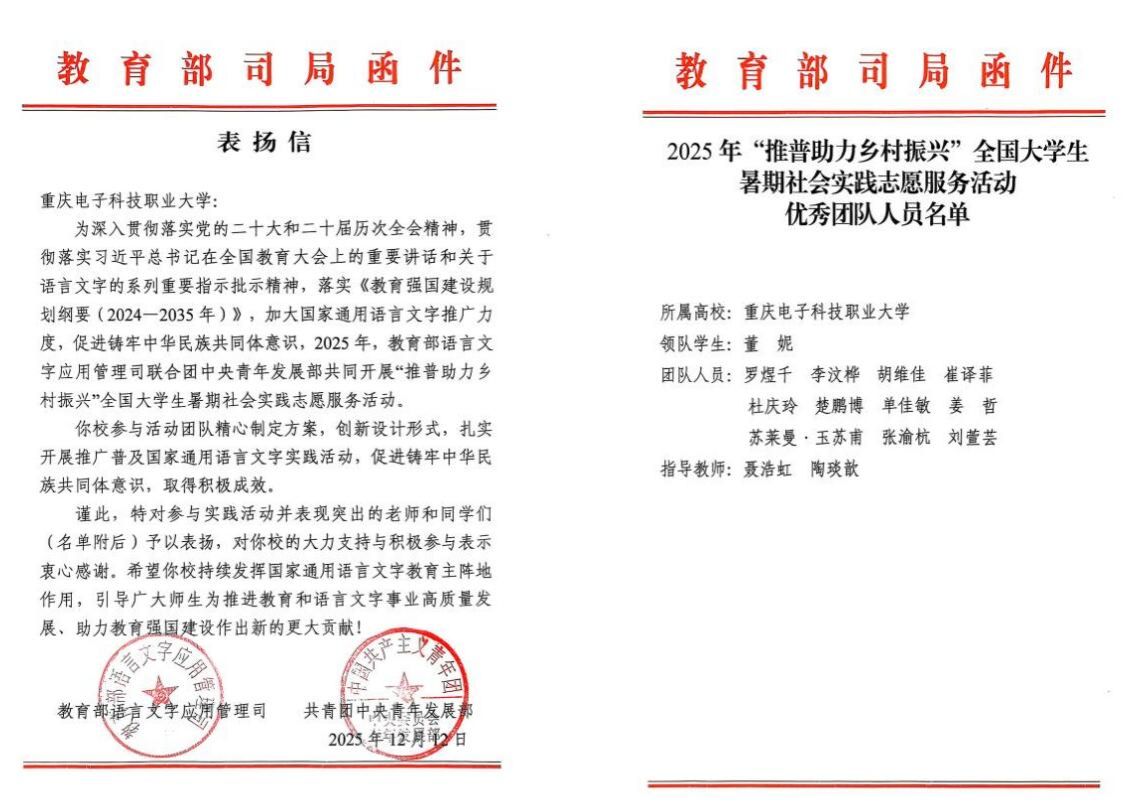 教育部、团中央致信表扬!重电“小手炉”获评全国“推普助力乡村振兴”优秀团队